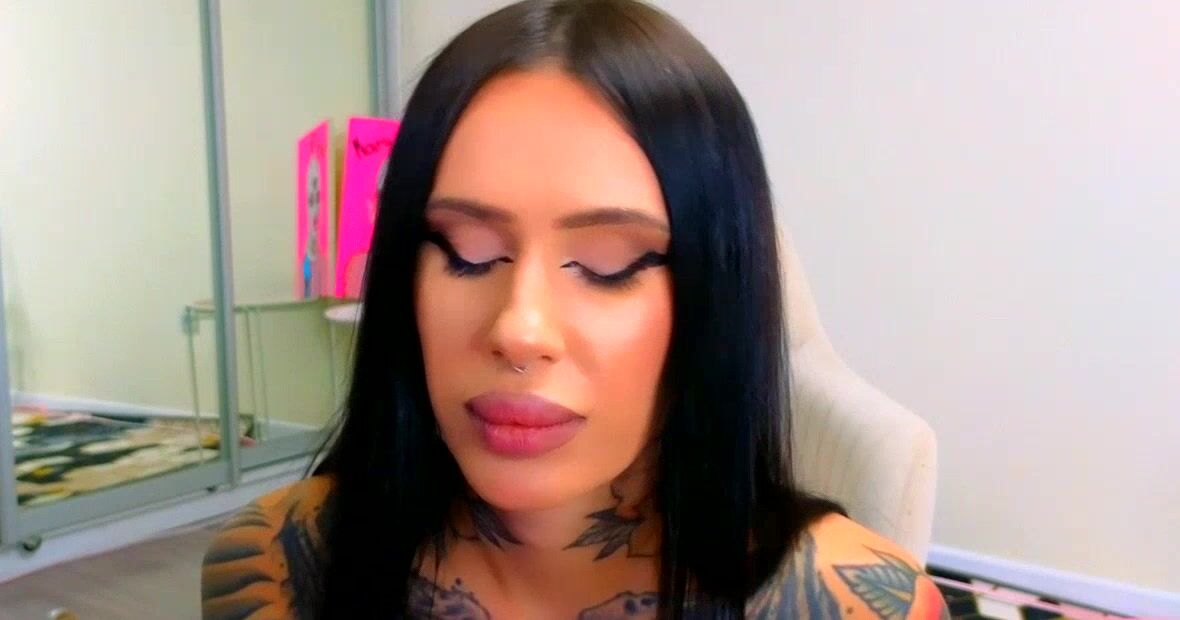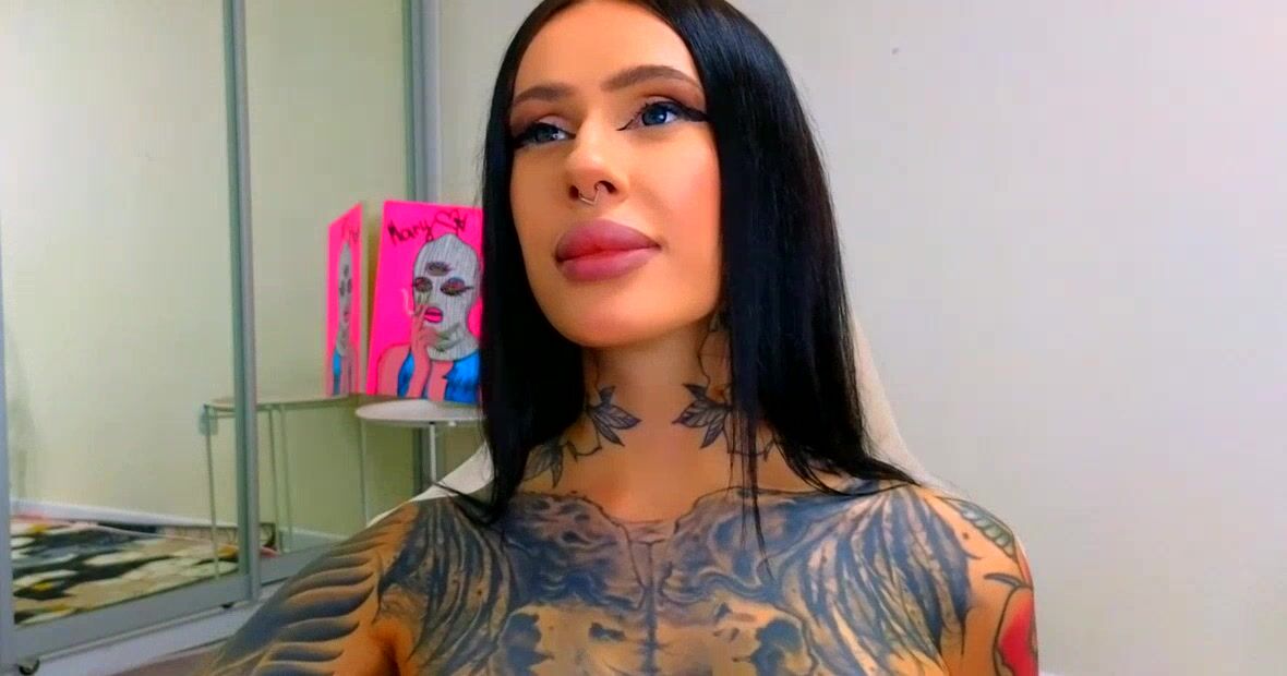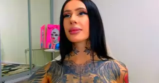 Brunette covered in tattoos shows her pussy and ass and fucks hard