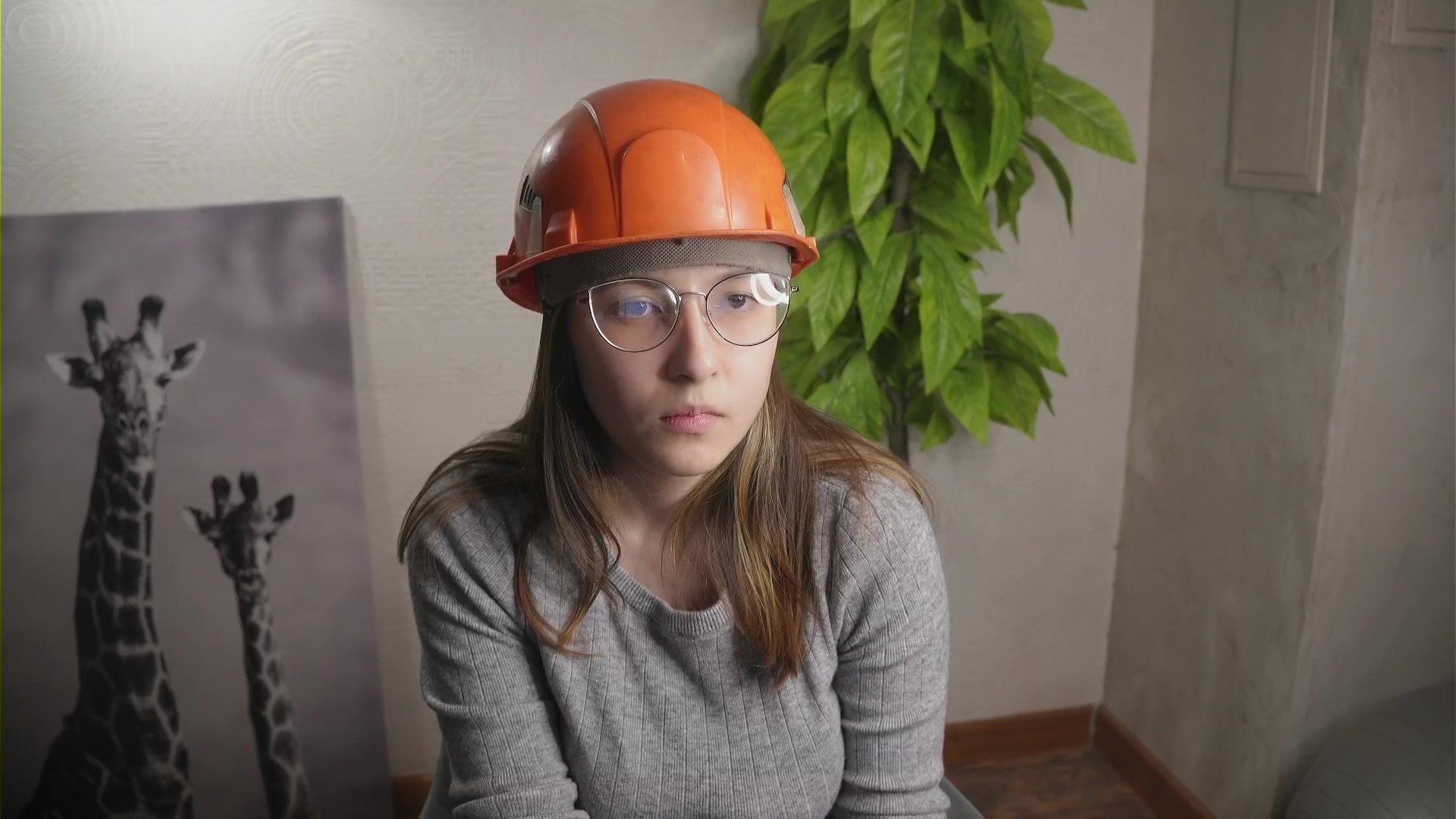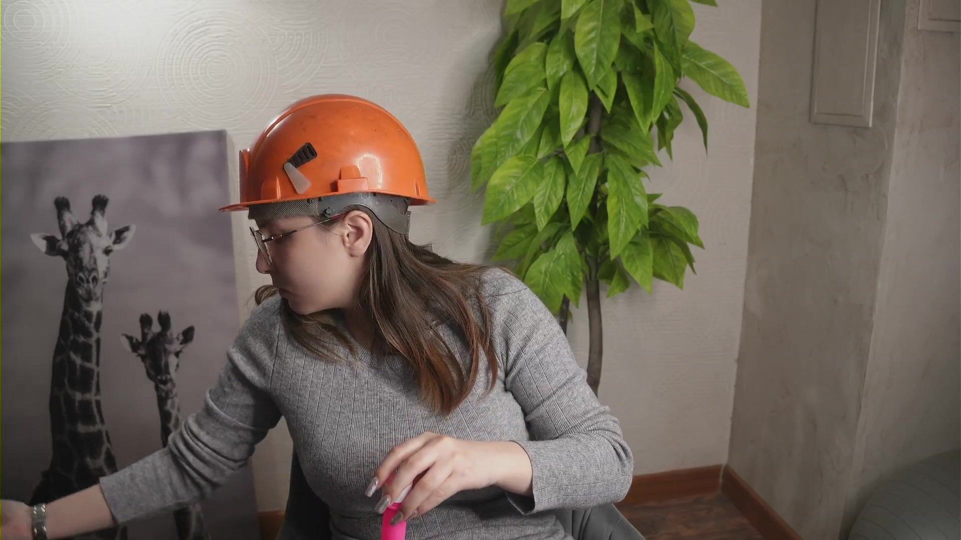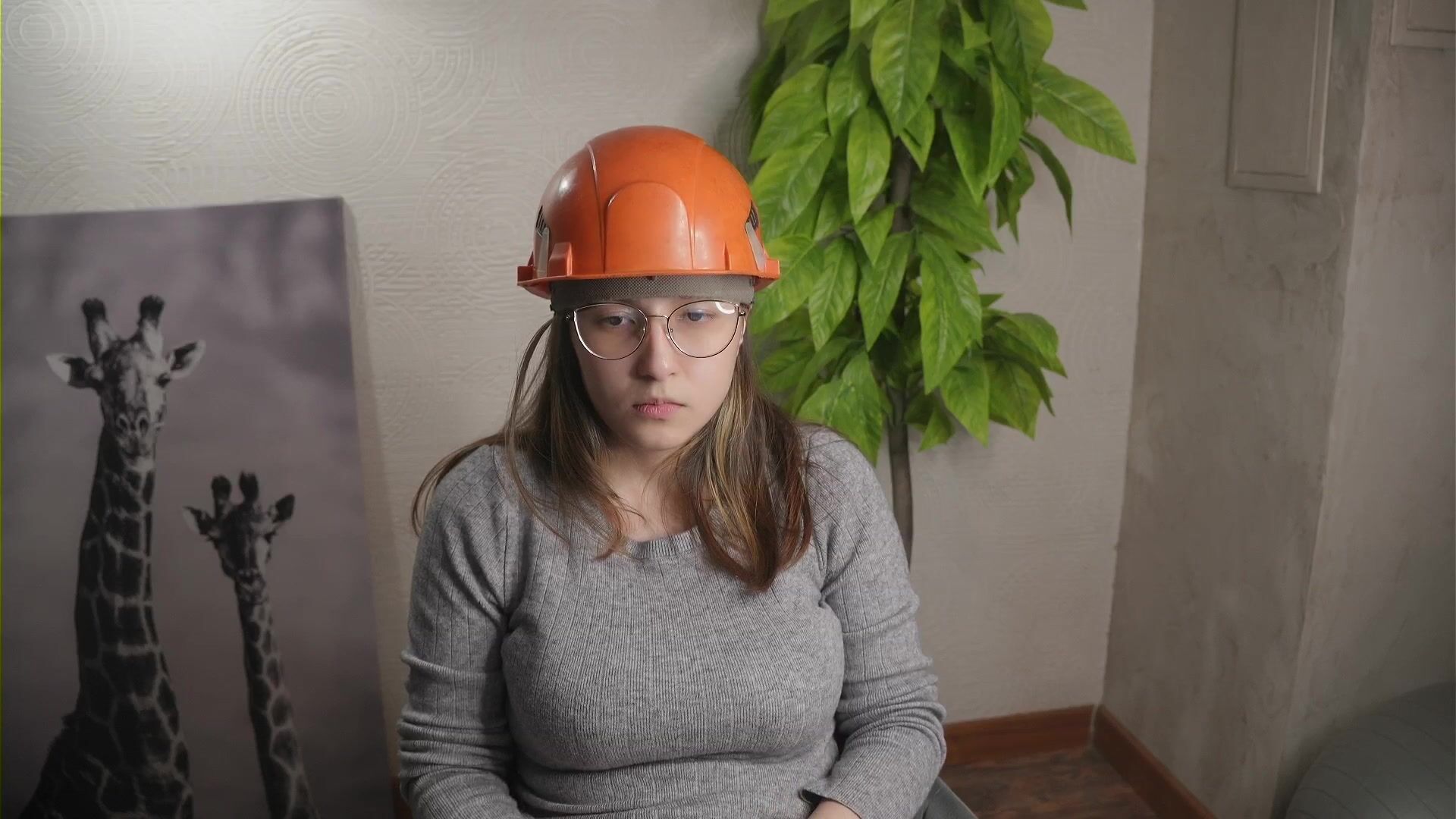 A young woman in clothes and a helmet chats sweetly and is embarrassed to undress
